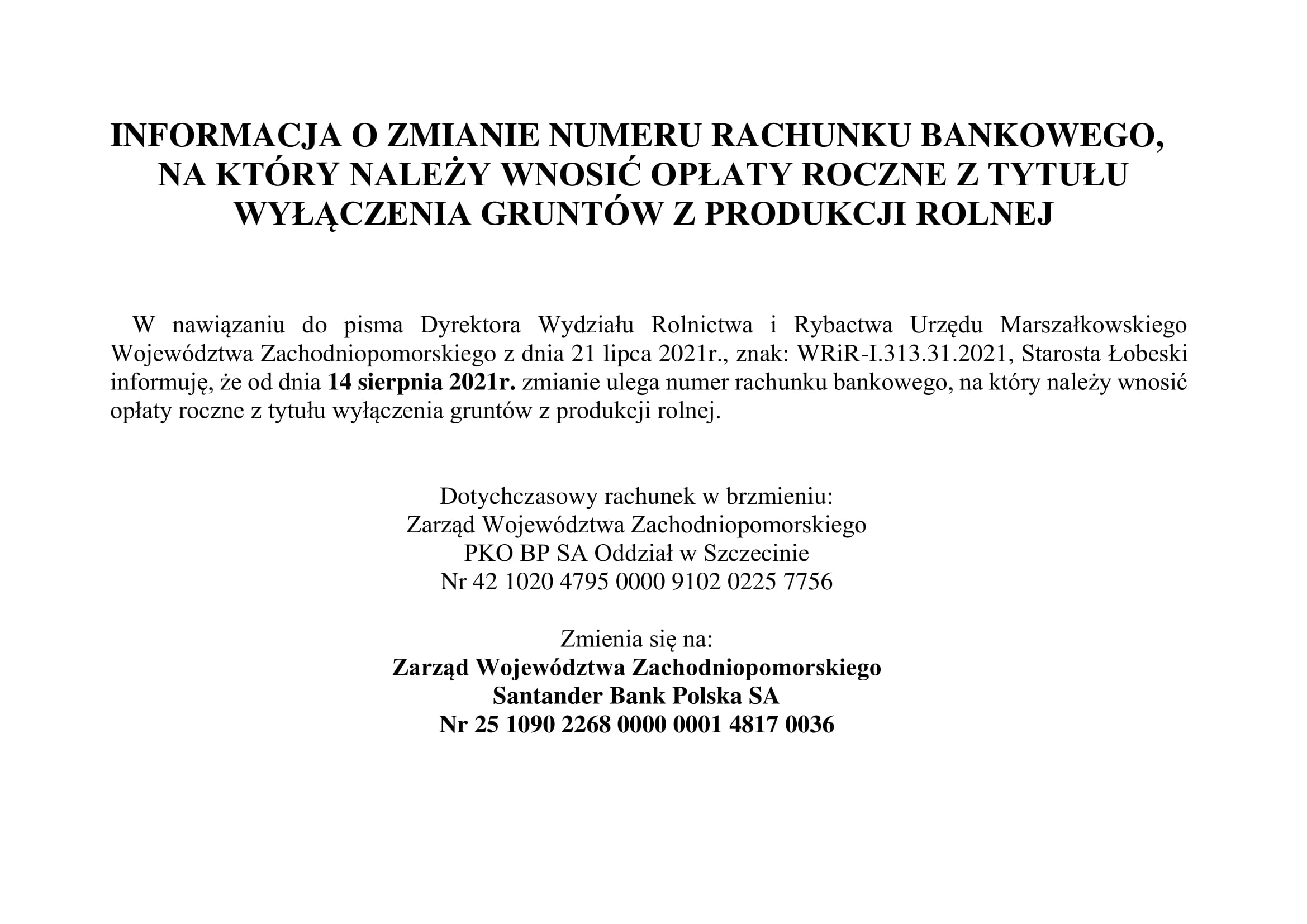 INFORMACJA O ZMIENIE RACHUNKU BANKOWEGO - Opłaty z tytułu wyłączenia gruntów