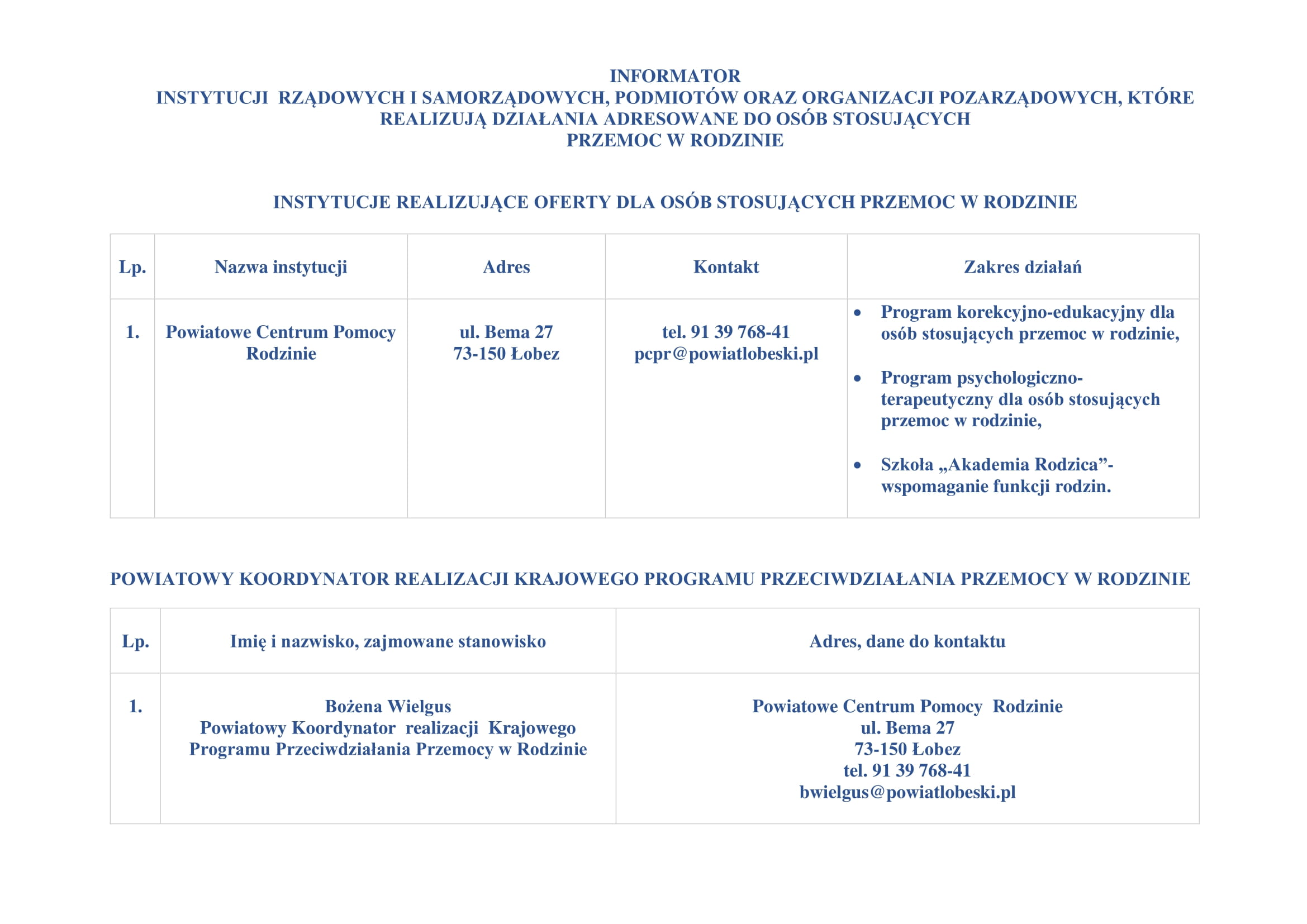 Informator instytucji rządowych, samorządowych, podmiotów oraz organizacji pozarządowych, które realizują działania adresowane do osób stosujących przemoc w rodzinie
