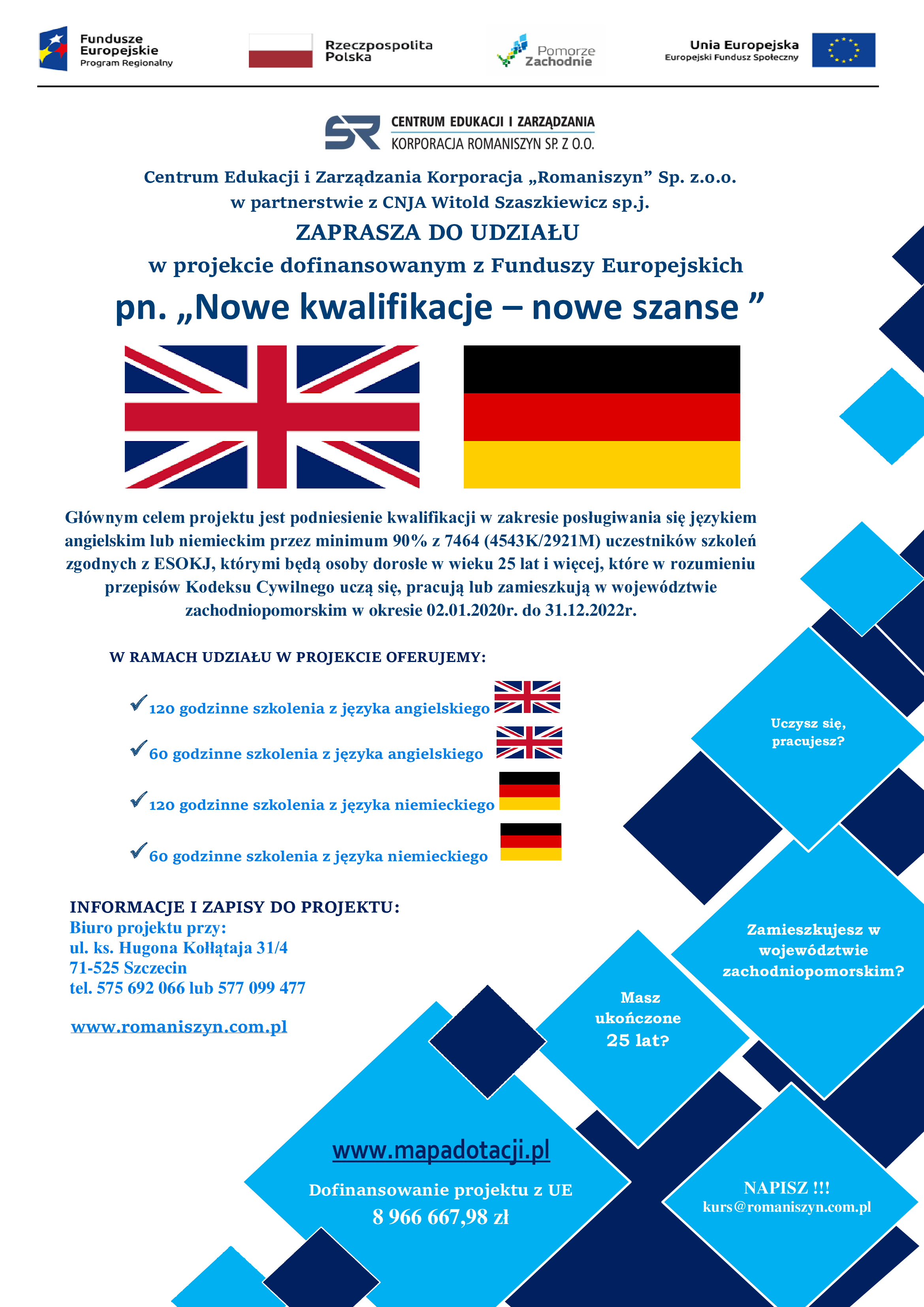 Zapraszamy mieszkańców Gminy do udziału w projekcie pn. „Nowe kwalifikacje – nowe szanse” nr: RPZP.08.10.00-32-K008/19, który jest realizowany na terenie województwa zachodniopomorskiego.