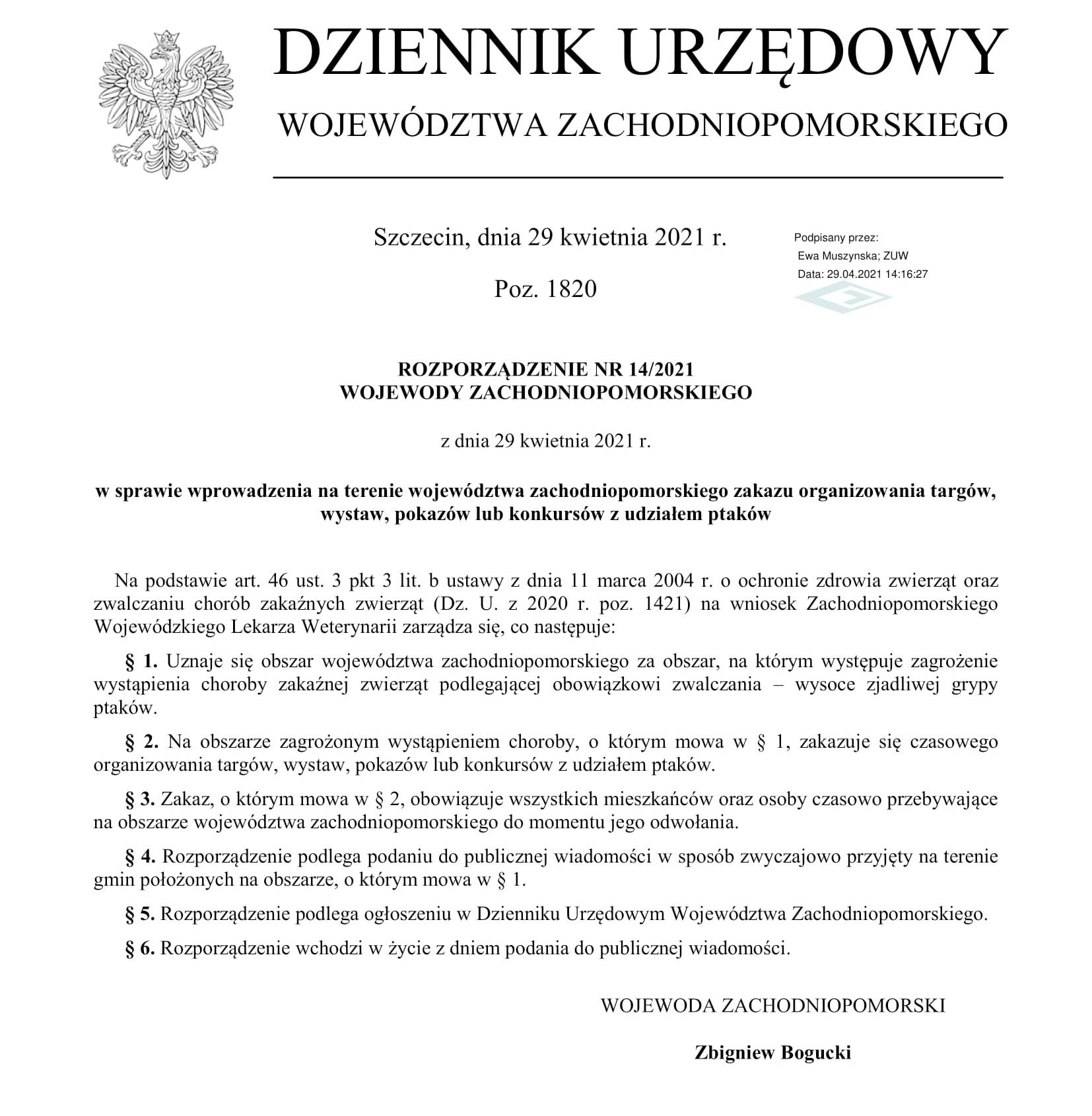 Rozporządzenie w sprawie zakazu organizowania targów, wystaw, pokazów i konkursów z udziałem ptaków