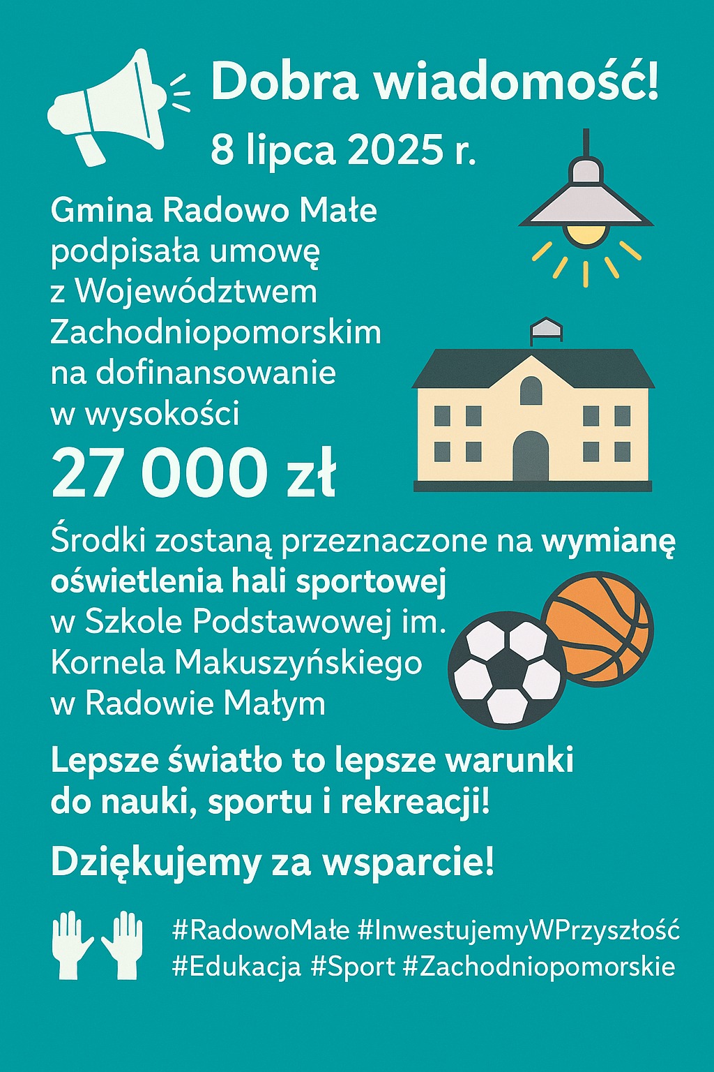 W dniu 08.07.2025 r. została podpisana umowa pomiędzy Województwem Zachodniopomorskim, a Gminą Radowo Małe w sprawie udzielenia pomocy finansowej w wysokości 27 000,00 zł na zadane pn. „Wymiana oświetlenia hali sportowej przy Szkole Podstawowej im. Kornela Makuszyńskiego w Radowie Małym.